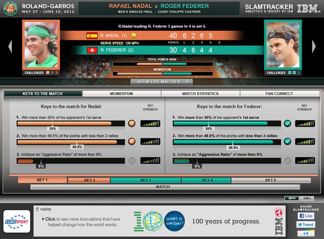 In de beginfase van afgelopen herenfinale Roland Garros stond Nadal lange tijd op voorsprong tegen zijn opponent Novak Djokovic. De fan experience-statistiekencomputer had op basis van historische data al aangegeven dat met het verstrijken van de tijd de kansen op overwinning van Nadal zienderogen aan het afnemen waren. Toen het ging regenen en de wedstrijd noodgedwongen gestaakt moest worden, gaf de fan experience-meter direct aan dat deze regenpauze in het nadeel was voor Nadal… die de wedstrijd uiteindelijk ook heeft verloren!