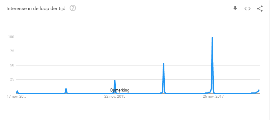 Er is een duidelijke stijging in de afgelopen vijf jaar te zien in de populariteit van Black Friday in Nederland. De zoekopdrachten begonnen voorheen elk jaar rond eind oktober, maar in 2018 zijn de zoekopdrachten naar Black Friday in eind september al begonnen. De grootste pieken zien we nog steeds rond de dag zelf, tussen 19 en 25 november.