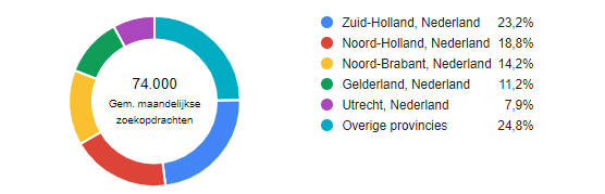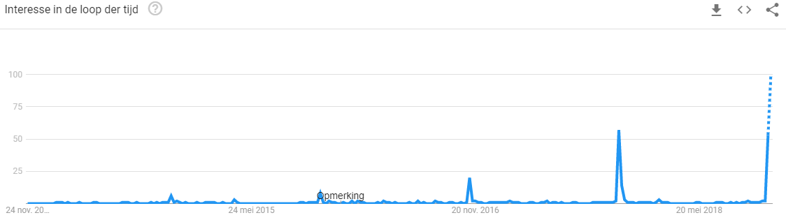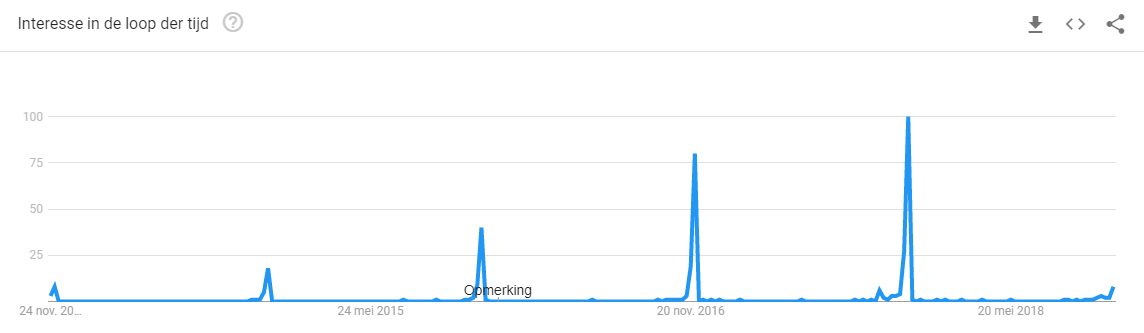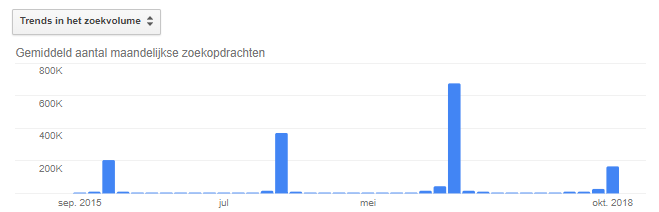 Bij Google Trends is het niet mogelijk om een analyse te maken op basis van absolute getallen, maar volgens de Google keywordplanner heeft de zoekterm momenteel een gemiddeld maandelijks zoekvolume van 74.000 in Nederland. Een kanttekening, door de seasonality van het zoekwoord zien we gedurende het jaar amper zoekopdrachten, terwijl er in oktober 2018 bijvoorbeeld sprake is van 165.000 zoekopdrachten. De grootste piek volgt nog, later deze week.
