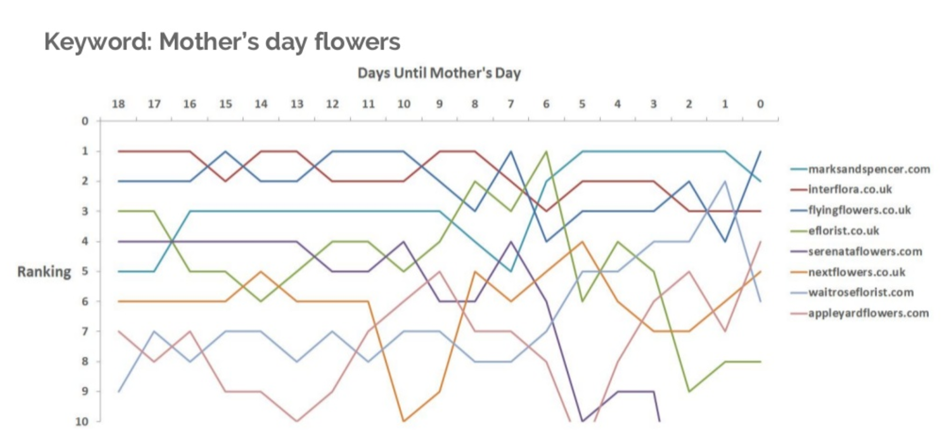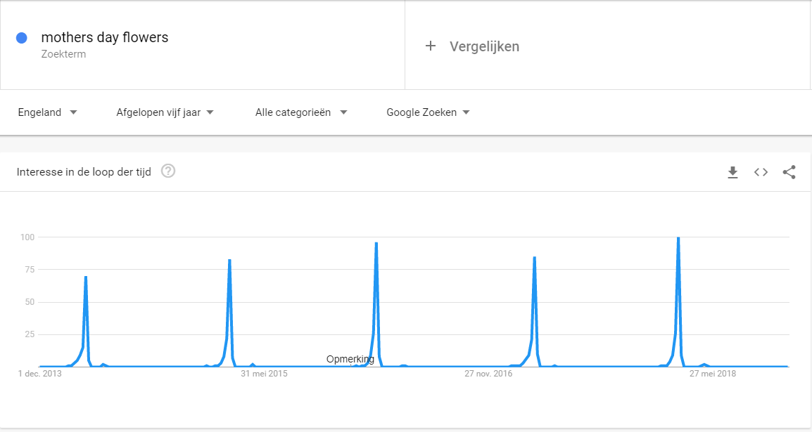 Op SearchLove London 2018 raakte ik in gesprek met Tom Capper. Tijdens zijn presentatie had hij het over een onderzoek dat hij had uitgevoerd naar de invloed van piek-zoekvolumes op rankings. Hij had dit gedaan voor de term ‘mothers day flowers’ en zag daarin flinke verschillen in de rankings op Moederdag zelf, ten opzichte van twee weken eerder. Zoals hieronder te zien is, geeft het zoekvolume net voor en tijdens Moederdag een flinke piek.