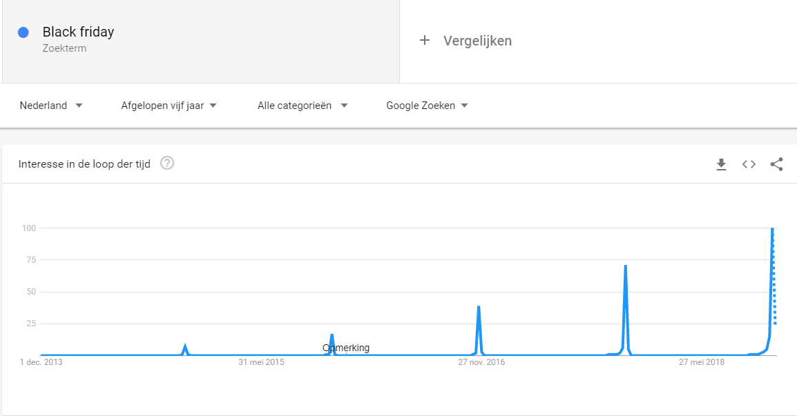 Tijdens ons gesprek ging het over de trend die te zien was en of Black Friday in Nederland een soortgelijke trend zou laten zien: veel zoekvolume in een zeer korte periode. Zoals in onderstaande grafiek te zien is groeit dit zoekvolume elk jaar flink, omdat Black Friday steeds meer in de media is en steeds meer Nederlandse bedrijven meedoen aan het kortingsfestijn.