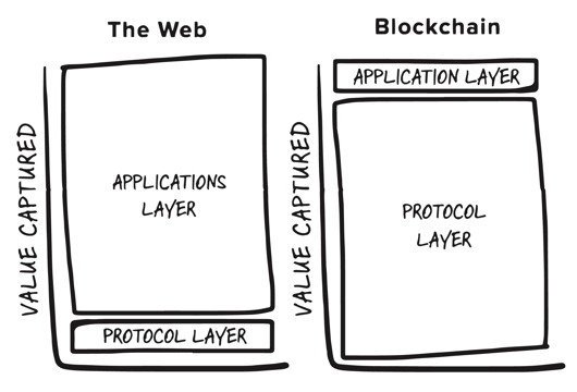 Als je naar het oude internet kijkt, heb je een hele dunne protocollaag, namelijk TCP/IP. De protocollaag is eigenlijk gewoon een set van afspraken waarin je data tussen computers kan uitwisselen. Bovenop dat dunne laagje protocol draaien allemaal grote applicaties, zoals Google, Facebook et cetera.