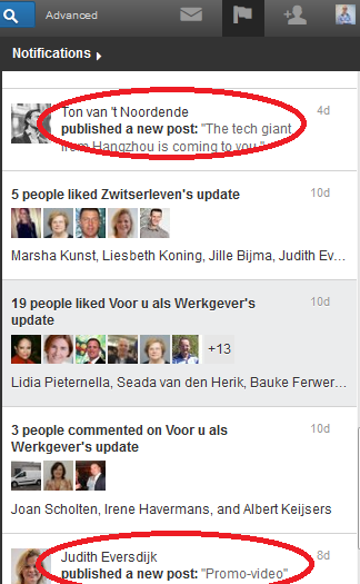 - Jouw netwerk krijgt naast een bericht in de tijdlijn ook een notificatie als jij een blog hebt geplaatst. Zie bijgaande voorbeelden.