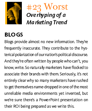 Alhoewel ik me had voorgenomen om deze weken eens echt vakantie te nemen lukt het me nog niet om mijn RSS-reader links te laten liggen. Zo struikelde ik zojuist over The Best & Worst Marketing Ideas of 2005 (pdf) van Brandweek. Een interessant document met de 25 beste en slechtste marketingideeen van 2005. Uiteraard staan weblogs ook in het lijstje maar toch iets anders dan menig blogger zich had voorgesteld.