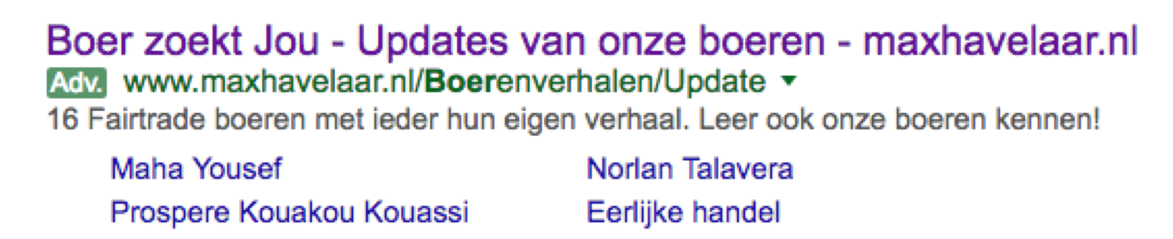 Tijd om de searchcampagne vorm te geven. We hebben ingezet op alle zoekwoorden die gerelateerd zijn aan het programma van Yvon Jaspers; van Boer zoekt Vrouw 2017 tot aan de namen van alle boeren die deelnemen. Zo krijgen mensen die op Google zoeken naar iets dat gerelateerd is aan Boer zoekt Vrouw een advertentie van Max Havelaar te zien.