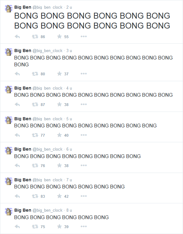 Of je gooit alleen een Twitter-accountje open, waarbij je enkel onzinnige content deelt. Zoals de eigenaar van de webwinkel deed: BONG. Weer een uur voorbij. Zo onzinnig dat het populair wordt. De enige echte @big_ben_clock (‘locatie: Up a tower’) heeft inmiddels ruim 451.000 volgers en de tweets zijn ronduit populair.