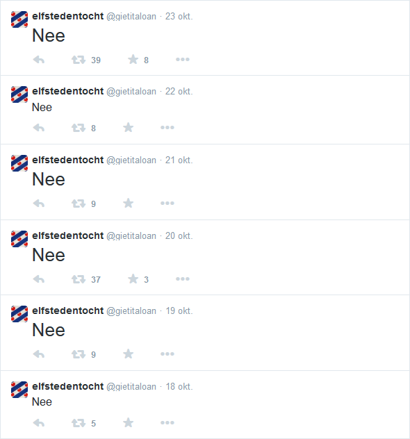 Of je beantwoordt gewoon domweg elke dag de ‘vraag der vragen’: gaat de tocht door? Giet it al oan? Dit kan nogal onzinnig zijn op de dag dat het asfalt onder je voeten net zo heet is als contentmarketing. Ja, behoorlijk onzinnig. En geliefd. Twitteraccount @gietitaloan plaatst dagelijks een tweet, altijd met dat ene woordje: ‘Nee’. De Elfstedentocht gaat nog niet door. Wel zit ‘ie inmiddels behoorlijk vastgeroest in het brein van de ruim 2.500 trouwe volgers. De officiële vereniging, die in 2014 slechts eenmalig een tweet verstuurde, zou niets met dit account te maken hebben. Nee, nee…