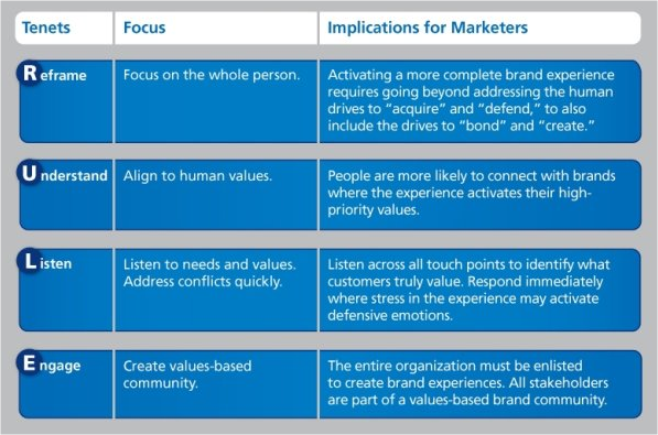 RULE legt de focus op de gehele persoon, ook de persoon ‘achter de consument’. Met dit als uitgangspunt kan een organisatie door middel van Understand en Listen (gaat verder dan het “platte” en/of conventionele monitoren) effectievere brand-to-consumer relaties opbouwen. Organisaties zullen in staat zijn om klantgerichtere proposities en ‘brand experiences’ te ontwikkelen die voor competitief voordeel zorgen. Deze gedachte past goed bij Drucker's “The aim of marketing is to make selling unnecessary.”