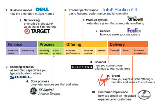 De experience is een interessant onderdeel binnen innovatie, die kan zorgen voor differentiatie. Onderstaande figuur geeft binnen Delivery zowel Brand als Customer Experience weer. Binnen Finance, Process en Offering valt er qua differentiatie niet meer heel veel te innoveren. Van echte USP’s is er nog maar weinig sprake en gezien de overwegend ontastbare aard van onze economieën, is het juist de Delivery die differentiatie met zich mee brengt. Of zoals Joe Pine aangeeft: Experience is een gepersonaliseerde dienst die aansluit op de consument.