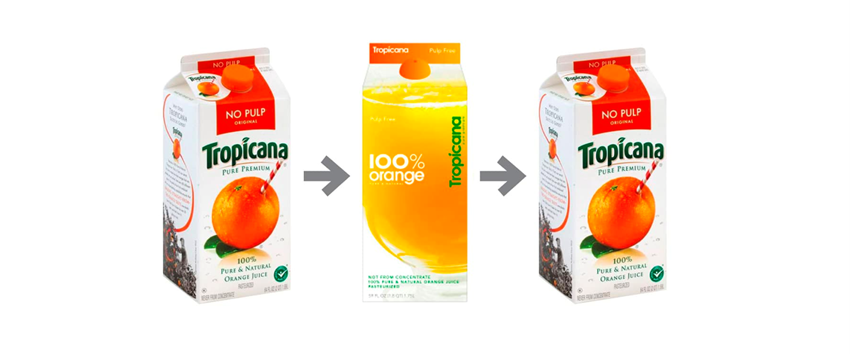 Tropicana veranderde de verpakking waardoor consumenten het niet meer herkenden in het schap. De operatie werd snel weer teruggedraaid, vele miljoenen omzetverlies later.