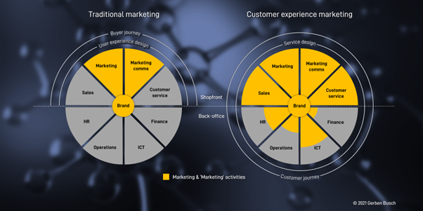 Want sinds de customer journey het werkterrein van ons marketeers is, is marketing niet beperkt tot de traditionele domeinen merk, marketing en communicatie. De marketing/BCX strategie vertaalt zich namelijk door naar alle business functies. En daarmee speelt iedereen zijn eigen rol in die business functie-overstijgende merk-waardige customer experience.