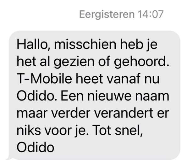 Collega Ed Stibbe RM plaatste een post op LinkedIn met daarin een screendump van het bericht dat hij, als klant van T-Mobile, van T-Mobile kreeg. ‘Hallo, misschien heb je het al gezien of gehoord. T-Mobile heet vanaf nu Odido. Een nieuwe naam maar verder verandert er niks voor je. Tot snel, Odido’.