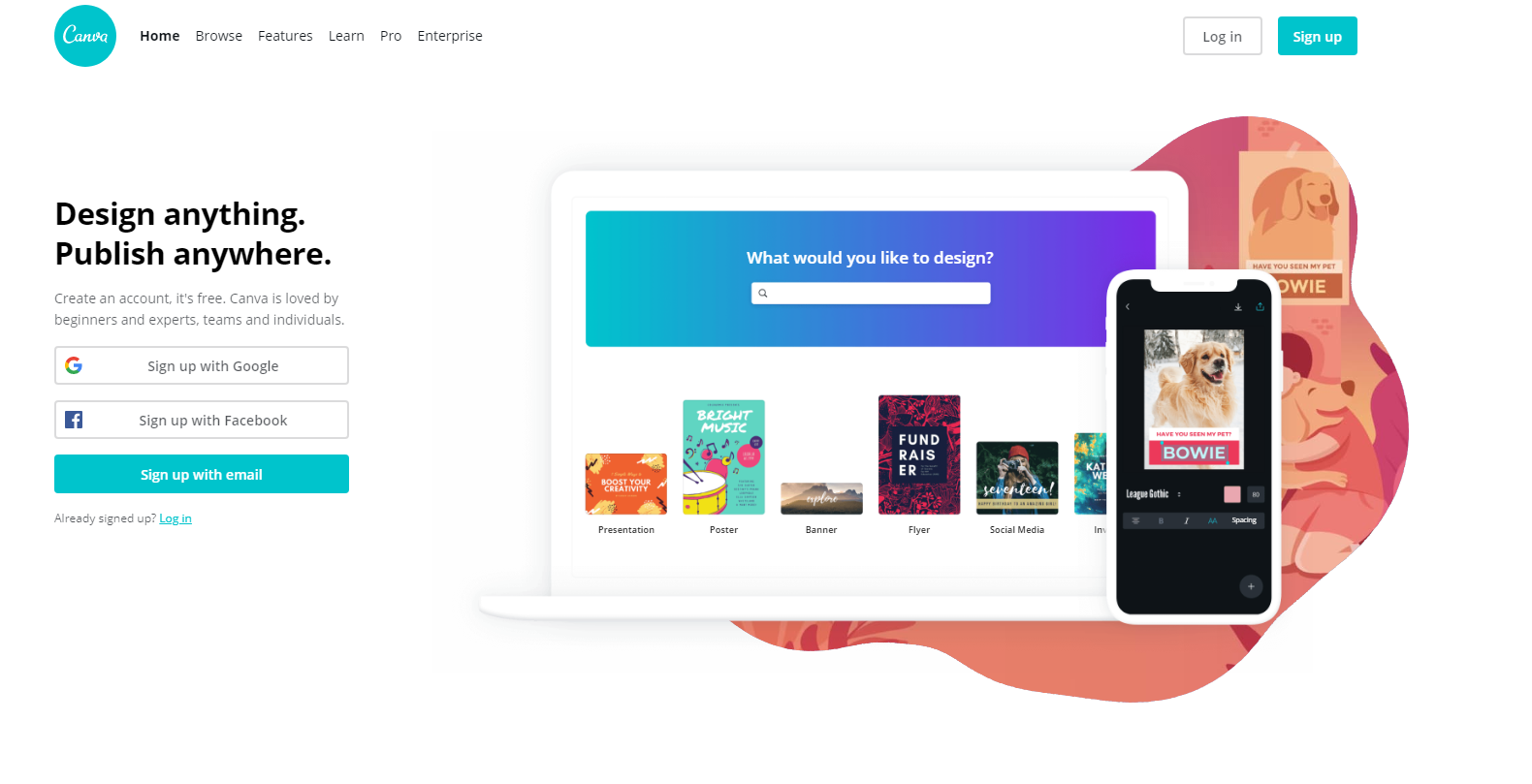 Dit is een multifunctionele dienst waarmee gebruikers kant-en-klare lay-outs kunnen bewerken en nieuwe kunnen aanmaken. Canva heeft een enorme database met gratis lettertypen, pictogrammen, achtergronden en kleurenschema’s.