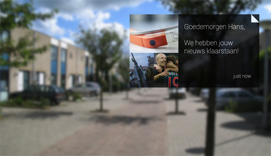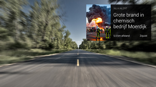Eén van de ontwikkelde toepassingen is NUalert. Met deze toepassing krijg je als Glass-drager een melding als er relevant locatiegebonden nieuws is. Bijvoorbeeld als er brand is in de buurt van waar je nu bent, waar je woont of waar je werkt. Maar ook: als er brand is langs je dagelijkse route – want die kent jouw Google Glass door de koppeling met Google Now. “Nieuws wordt op deze manier veel meer een individuele ervaring,” zegt Brechtje.