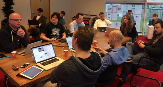 Raimo van der Klein (Glasseffect, links) aan de slag met de developers van NU.nl