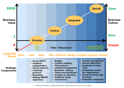 De vraag is hoe ver jij als bedrijf staat in die andere adoptiecurve: die van de social media-maturiteit. De meeste bedrijven zitten nog in de fase van ‘emerging’ en ‘tactical’. Integratie is zelden een realiteit, de volgende stappen zijn nog uitzonderlijker.