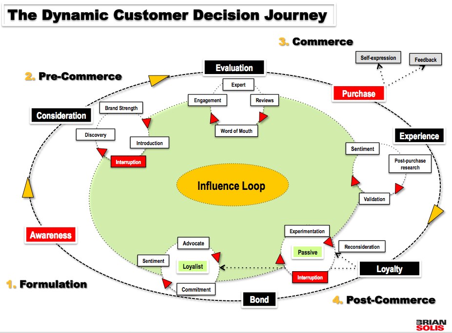 Het denken in de traditionele salesfunnels is om die reden achterhaald. De klant houdt zich niet aan dat rechtlijnige model. Solis heeft daarom zijn Dynamic Customer Decision Journey-model ontwikkeld. Dit model integreert het oriëntatie- en aankoopproces van klanten met de vele nieuwe touchpoints die digitale en sociale media daarbij introduceren.