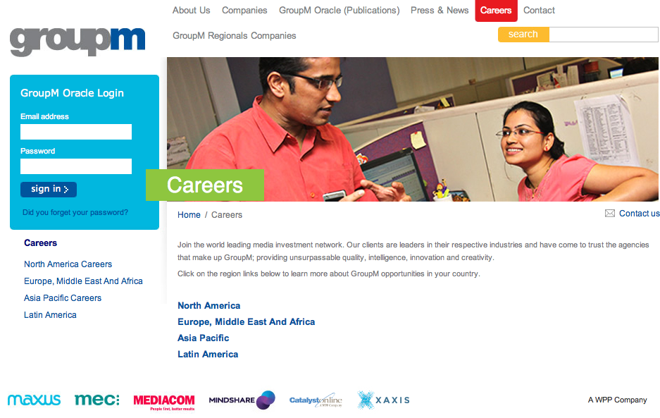 Bij GroupM, waar onder andere Mediacom, MEC en Mindshare onder vallen, en dat in Nederland ook met o.a. GroupM seach actief is, kom je via groupm.nl op de internationale site. Het carrièredeel hiervan ziet er als volgt uit.