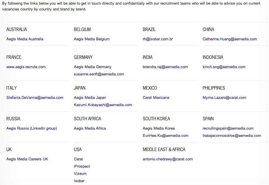 Dit alles nog even afgezien van de onprofessionaliteit die deze pagina uitstraalt, waarbij je bij de een moet mailen, de ander een sitelink heeft en een sollicitant eigenlijk dus niet echt geholpen wordt. Aegis Nederland heeft dan nog wel een eigen pagina (in tegenstelling tot GroupM), maar daarop is geen vacature te vinden. Wel een verwijzing naar de Aegis Academy, maar die verwijst weer door naar de Facebook-pagina, ook daar wordt je als sollicitant niet wijzer van.
