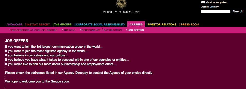 De internationale pagina van Publicis is net zo'n drama als die van de andere twee. Ze willen heel graag dat je voor ze komt werken, maar je moet zelf op een ander deel van de site (zonder link) zoeken welk kantoor je moet hebben en dan daar verder zoeken.