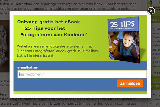 De pop-up heb ik zelf gemaakt met behulp van Fancybox en met de best practice-tips van Conversion Voodoo. Ook heb ik de pop-up zo ingesteld dat hij niet direct getoond wordt, maar pas nadat een bezoeker 40 seconden op de pagina gezeten heeft. Klikt iemand snel weer weg, dan krijgt hij de pop-up dus ook niet te zien. Heb je interesse in het artikel dat je gevonden hebt, dan word je op de nieuwsbrief en het gratis eBook gewezen.