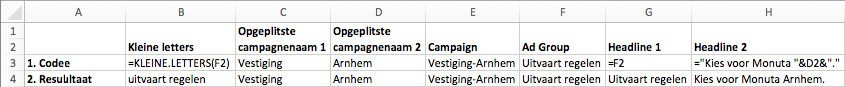 In het screenshot staat op regel 3 de Excel-code (in cel B3, G3 en H3) en op regel 4 het resultaat van de code, zoals deze in Excel weergegeven zal worden. Dit is een handige manier om voor veel locaties meerdere advertenties te maken die wel een specifiekere focus nodig hebben.