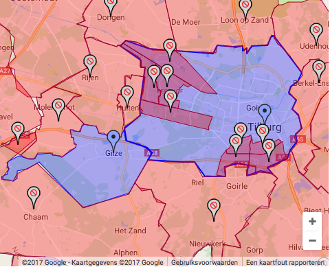 Zoals in bovenstaande afbeelding te zien is, zijn alle omringende locaties uitgesloten. Datzelfde geldt ook binnen de getargete locatie voor een aantal postcodegebieden. Deze behoren namelijk toe aan een andere vestiging. Let op dat uitsluiten via een op radius getarget gebied niet kan.
