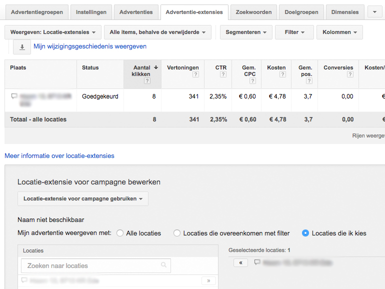 Nu kan je in AdWords bij Advertentie-extensies, en dan de weergave “locatie-extensies”, een adres aan een campagne toevoegen, zoals in onderstaand screenshot.