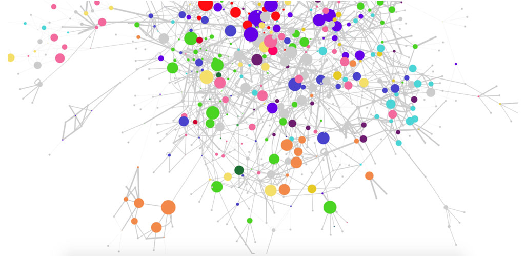 Daarnaast is gekeken naar de wijze waarop het kijkgedrag en uitzendingen van diverse omroepen samenhangen met elkaar. Elke kleur is een omroep, elke cirkel representeert een uitzending. Hoe groter de cirkel, hoe langer de kijkduur.