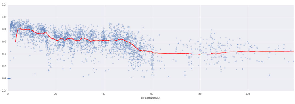 Het bepalen van de juiste kpi’s is essentieel. Stel dat het uitkijken van video een prestatieindicator is, dan is het aan te bevelen om de duur van video te maximaliseren op 5 minuten en content van Katja Schuurman en kattenfilmpjes te tonen. In onderstaande grafiek is bijvoorbeeld te zien wat de verhouding is tussen de lengte van en video en het percentage kijkers dat de volledige video heeft bekeken.