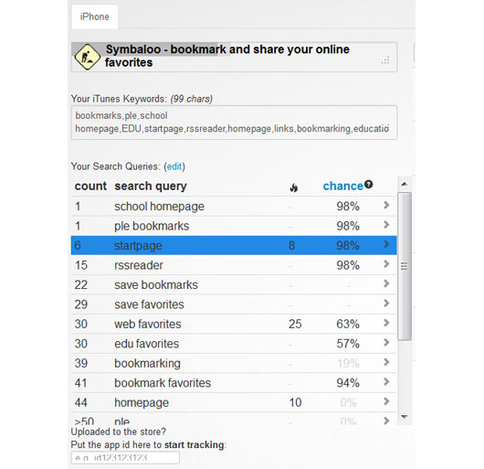 Het vindbaar maken van een app in de App Store wordt ASO genoemd, oftewel App Store Optimization. Naast de naam is er ruimte voor keywords, maar je hebt slechts 100 karakters. De omschrijving zelf wordt niet geïndexeerd. Het is daarom aan te raden om niet alleen de naam voor de app te gebruiken, maar er ook je belangrijkste keywords in te verwerken. Zo hebben we bij Symbaloo gekozen voor “bookmark en deel je online favorieten”.