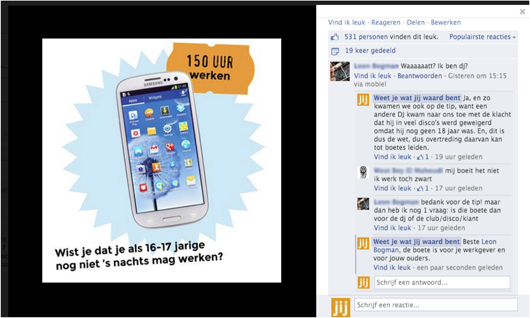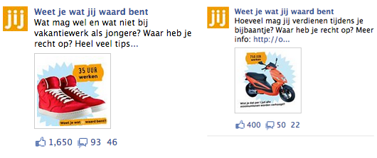 - De kleine brokjes informatie werden ‘wistjedatjes’ die makkelijk door te geven waren. Deze werden als gewone posts, Page Post Ads, right-hand-side-advertenties en als tweets of promoted tweets zo goed mogelijk gericht op jongeren. Op Facebook is de doelgroep verder uitgesplitst in 13/14-jarigen, 15-jarigen en 16/17-jarigen om zo relevant mogelijke content te tonen.