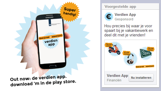 - In dezelfde periode werd ook een app gelanceerd waarin jongeren konden sparen voor hun spaardoel en waarvan de mijlpalen ook gedeeld konden worden. De app kon op mobiel direct gedownload worden vanuit de campagne: advertenties op Facebook via app-install-ads en op Twitter via app cards onder de promoted tweets.