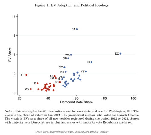 En op alle vlakken kijken Democraten in de Verenigde Staten positiever naar elektrische auto’s dan Republikeinen. Slechts 13 procent van de Republikeinen zegt open te staan voor de aanschaf; onder Democraten is dit 45 procent. In een ander onderzoek stelt 31 procent van de Democraten geen elektrische auto te willen kopen. Onder de Republikeinen is dit 82 procent.