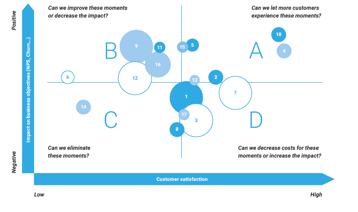 Hoe verbeter je een customer journey zodanig dat het mes aan twee kanten snijdt? Oftewel, dat het klantbelang én het organisatiebelang geborgd worden. De CX impact matrix helpt om de prioriteit te bepalen. Hierin worden alle contactmomenten geplot op klanttevredenheid enerzijds en de relatieve impact op businessdoelstellingen (bijvoorbeeld churn, omzet, NPS, CES) anderzijds. De grootte van de bol geeft het volume van een contactmoment weer. Bij ieder kwadrant hoort een strategie. Zoals ‘meer mensen een moment laten meemaken’ of ‘de kosten van een contactmoment minimaliseren’.