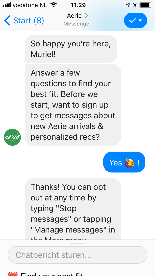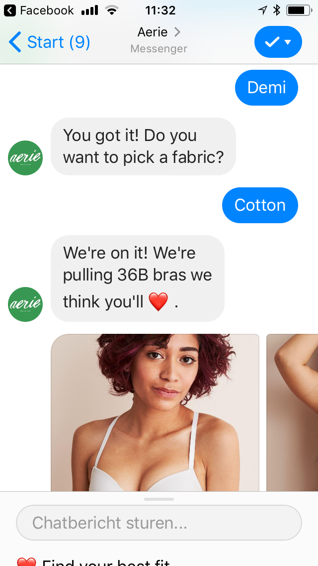 Facebook Messenger chatbot Aerie ondersteunt de marketing door toestemming te vragen voor het sturen van pushberichten, maar helpt ook bij de keuze en aanschaf van een bh.