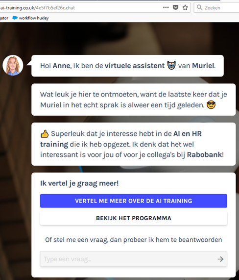 AI-training.nl zet ter ondersteuning van de e-mailcampagne en het uitstralen van innovatieve ideeën een chatbot in die klanten persoonlijk begroet en nadere informatie over de trainingen geeft en waar het programma aangevraagd kan worden.