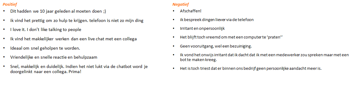 Aan de andere kant levert het reviewen van de conversaties ook veel waardevolle informatie, op doordat je een goed beeld krijgt van de vragen die een klant stelt. Dit kan ook leiden tot nieuwe inzichten doordat klanten opeens vragen aan een chatbot stellen die ze nooit eerder durfden te stellen aan een mens.