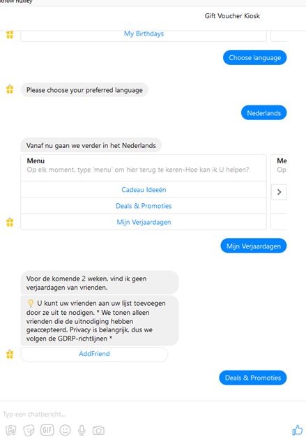 De Facebook messenger chatbot Gift Voucher Kiosk geeft de gebruiker de mogelijkheid om tijdens de conversatie over te schakelen naar een andere taal (Nederlands, Engels of Frans).