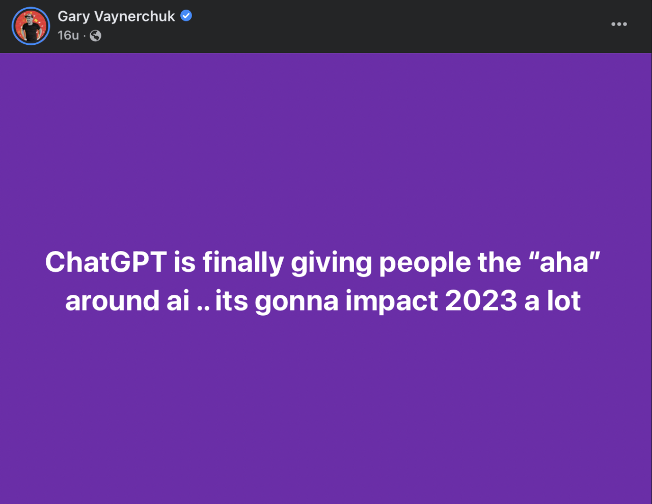 We beginnen even met een post van een kenner. Gary Vaynerchuck. De man die altijd redelijk goed in de gaten heeft waar de kansen liggen. Die zegt onomwonden: ChatGPT is finally giving people the “aha” around ai…it’s gonna impact 2023 a lot.