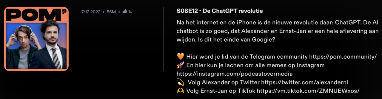 In de Podcast over Media (POM, waarschijnlijk betaalmuur) stelt Alexander Klöpping de volgende vraag aan Ernst-Jan Pfauth: Klopt het volgende rijtje? Internet-iPhone-ChatGPT? Om maar aan te geven hoe indrukwekkend zij de introductie van ChatGPT ervaren. Een paradigma shift. In de podcast filosoferen ze over de mogelijkheden van deze tekstgenerator. Natuurlijk is het dan niet vreemd om na te denken of het zelfs mogelijk is dat het Google van de zoektroon gaat stoten.
