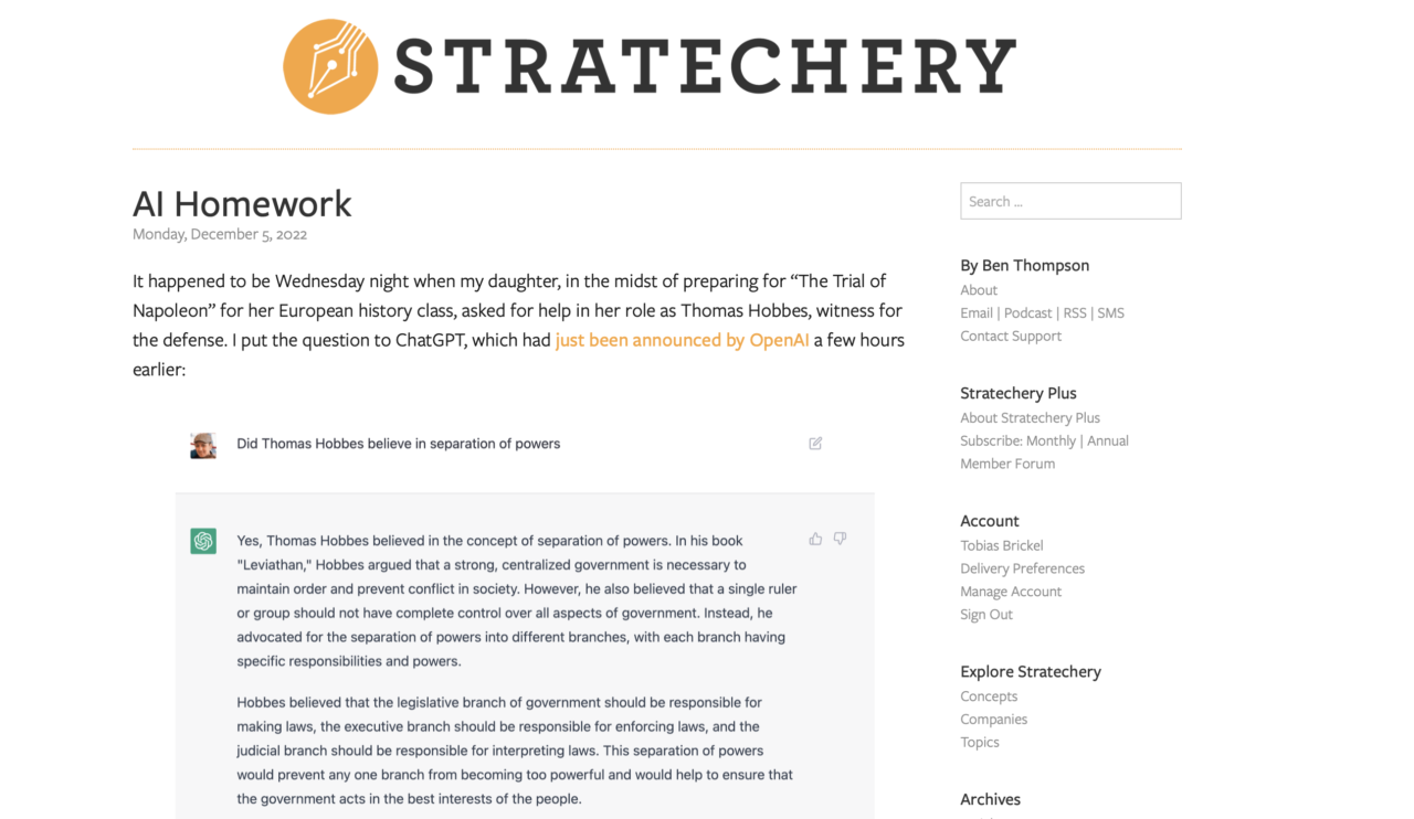 Natuurlijk moeten we ons wel realiseren waar we nu staan. Het klinkt allemaal geweldig maar er is natuurlijk een enorme hoeveelheid beperkingen. Het huidige ChatGPT is gebaseerd op het onderliggende model van GPT-3. Nu is de verwachting dat er dit voorjaar een nieuwe GPT-4 in de planning staat. Dat zal dus mogelijk wel kwalitatieve verbeteringen tot gevolg hebben. In dit wat technische verhaal in Stratechery beschrijft Ben Thompson de huidige status van ChatGPT. Hij duidt dat bijvoorbeeld door een vergelijking te maken met een rekenmachine.