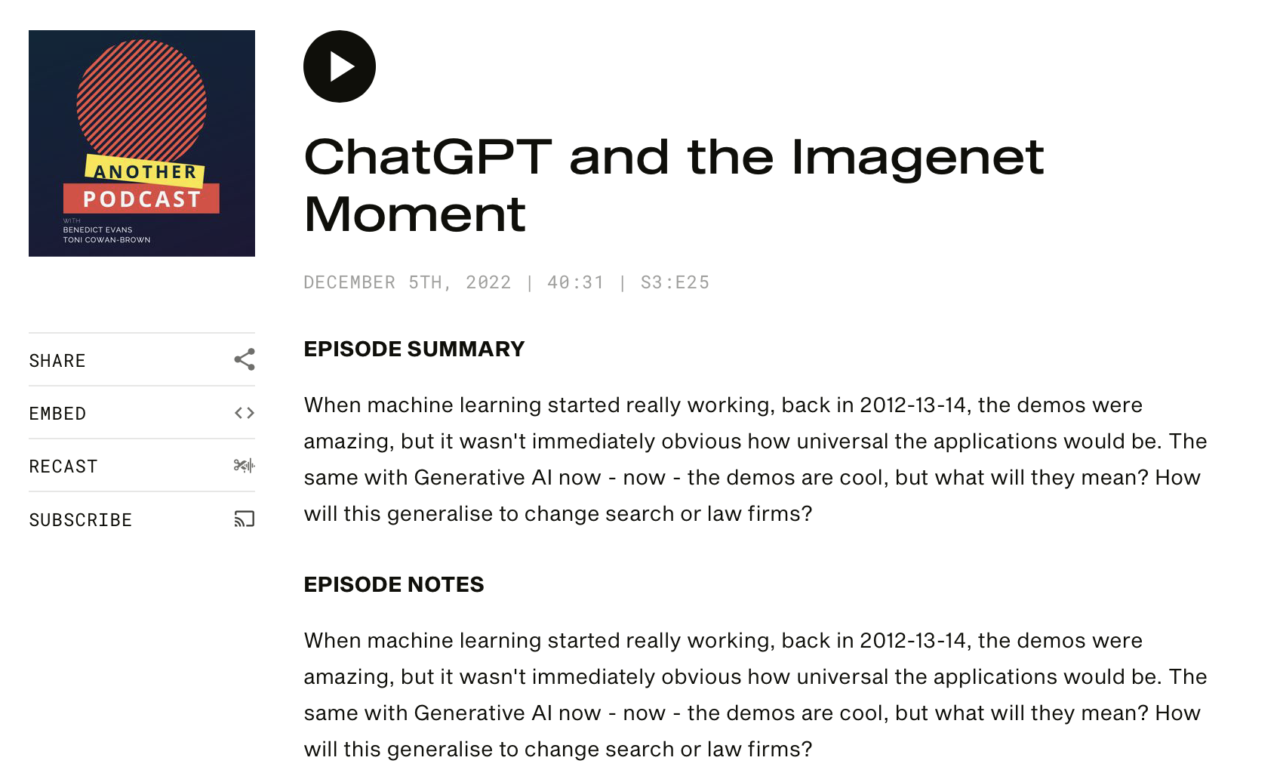 In ”Another Podcast” bespreken Benedict Evans en Toni Cowan-Brown de gevolgen van ChatGPT. Ze maken een vergelijking met het begin van machine learning-toepassingen. De demo’s waren geweldig maar het was niet meteen duidelijk hoe universeel de toepassingen zouden zijn. Is dat nu hetzelfde voor de huidige generatieve AI want opnieuw zijn de demo’s cool, maar wat zullen ze betekenen? Toch zal je ook hier beluisteren dat er naast kritische opmerkingen ook wel kansrijke vergezichten ontstaan. Al was het om de term “search” te splitsen in een zoekopdracht om iets te kopen of om iets te weten te komen.