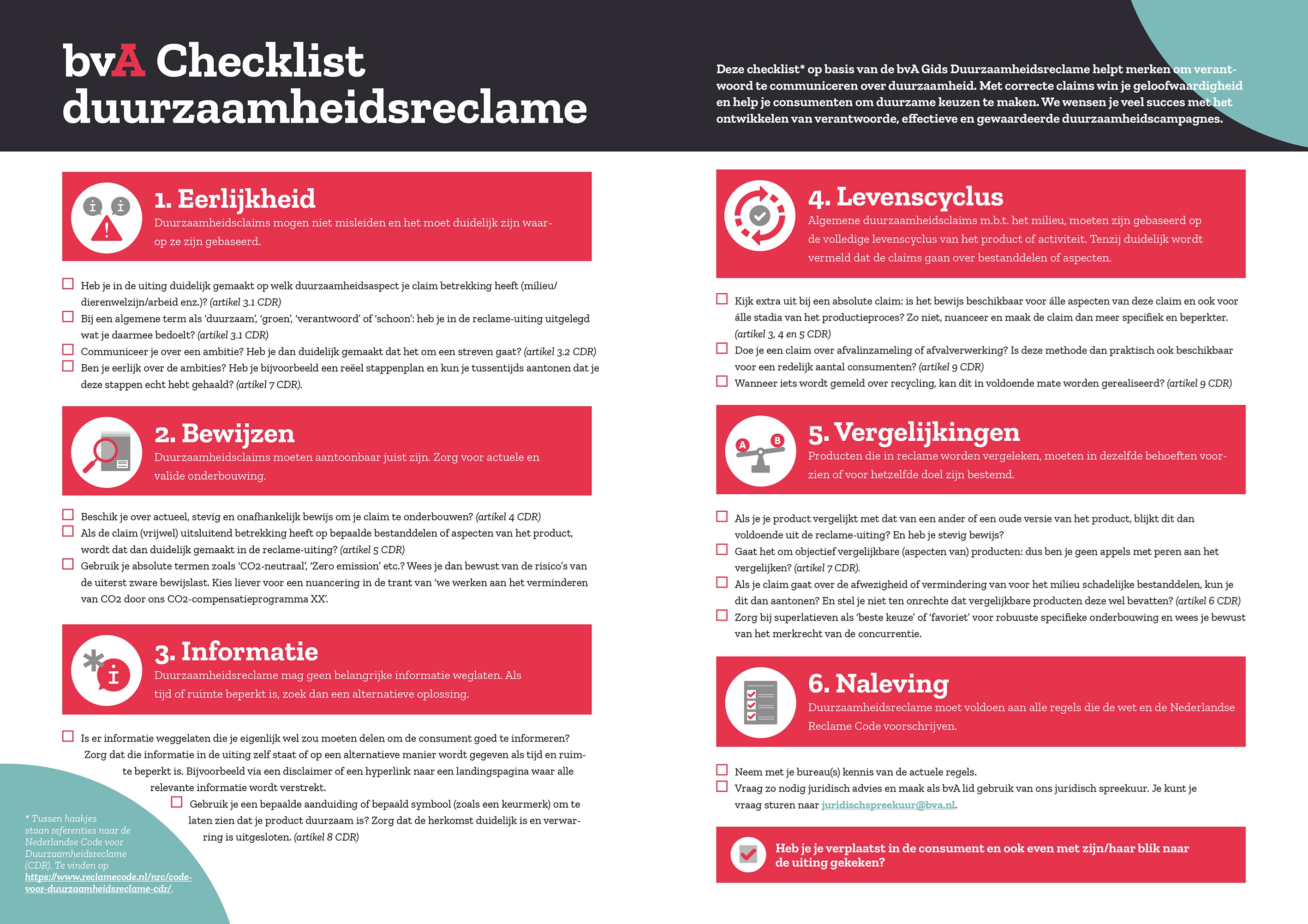 De gids en de checklist vind je hieronder. Over de checklist schrijft bvA: “Met correcte claims win je geloofwaardigheid en help je consumenten om duurzame keuzen te maken. We wensen je veel succes met het ontwikkelen van verantwoorde, effectieve en gewaardeerde duurzaamheidscampagnes.” Tussen haakjes staan referenties naar de Nederlandse Code voor Duurzaamheidsreclame van de Reclame Code Commissie.