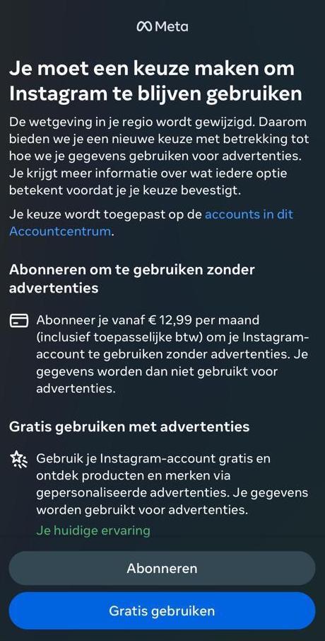 Vanaf november 2023 worden betaalde abonnementen voor Facebook & Instagram geïntroduceerd door META. Gebruikers kunnen voor 13 euro per maand de apps zonder gepersonaliseerde advertenties gebruiken. Of niet, je kan ook gebruikmaken van het platform zonder te betalen. Je dient dan expliciet toestemming aan META te geven voor het volgen van jouw online gedrag en het tonen van gepersonaliseerde advertenties. In de ogen van META voldoen ze met deze toestemming aan de wetgeving en kunnen ze doorgaan met het tonen van gepersonaliseerde advertenties. Het is op dit moment onduidelijk of de privacy waakhonden deze methode zullen accepteren.