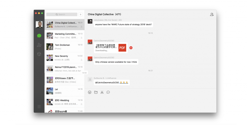Hieronder vind je een screenshot van mijn WeChat op mijn laptop. Daarop zie je de ‘China Digital’ groep met mensen die ik niet ken, hetzelfde met ‘Marketing Committee’ waar een PDF wordt gedeeld, mijn broer, Seventy Agency Shanghai, twee projectgroepen voor klanten, mijn vrouw, een andere projectgroep en een collega.
