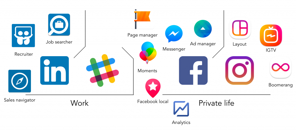 Het wordt interessanter als we naar media kijken. In het Westen scheiden we netjes onze social media in categorieën voor werk (LinkedIn of Slack), en voor vrienden en familie (Facebook, Instagram). Instagram en LinkedIn werden juist zo populair omdat ze een nauw gedefinieerde functie hadden. Het past bij onze dubbele levens. We houden werk en privé gescheiden — en we scheiden zelfs apps.