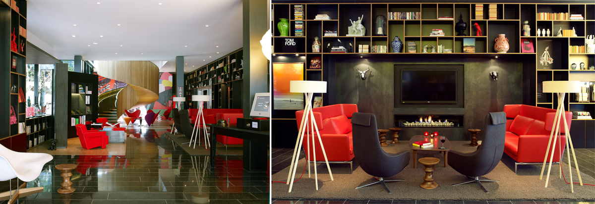 Ik word in het Engels begroet door een medewerker, die ambassadeurs worden genoemd, zo zal mij later duidelijk worden. We lopen langs verschillende eigentijdse ruimtes, afgescheiden door wanden met kasten stijlvol voorzien van boeken van de Amsterdamse boekhandelaar Mendo, exotische snuisterijen van over de hele wereld en onze nationale trots Delfts Blauw. Je kunt er tv kijken, een boek lezen, in klein comité vergaderen, gebruik maken van één van de Macs met aangesloten printer of gewoon wegzakken in de comfortabele polder sofa van ontwerpster Hella Jongerius.