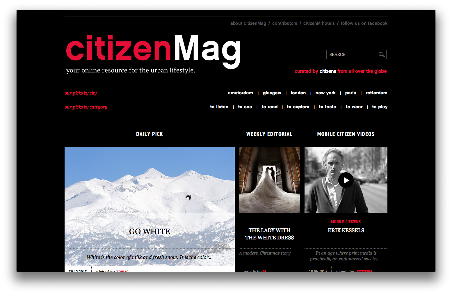 Het hotel is vernoemd naar haar doelgroep ‘mobile citizens’ en is volledig geïnspireerd op de wensen en vooral ook frustraties van dit nieuwe type reiziger. Betaalbare luxe in een inspirerende, huiselijke omgeving is wat citizenM biedt. In Rotterdam is op 10 december het derde hotel in Nederland geopend. Er zijn er daarnaast twee in de UK en er wordt gebouwd in New York, Parijs en Istanbul.