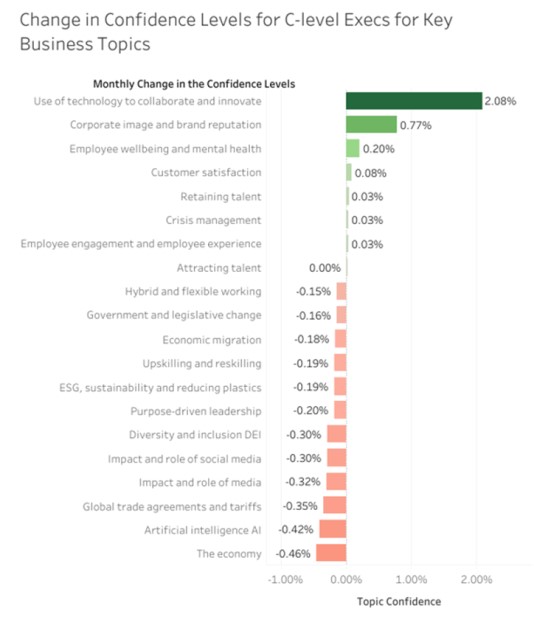 Confidence – Level of confidence change is calculated through natural language processing techniques that analyze the sample’s conversations per topic over time and comparatively against each of the other key business topics. The numbers you see on charts are the change in confidence levels from the previous month.